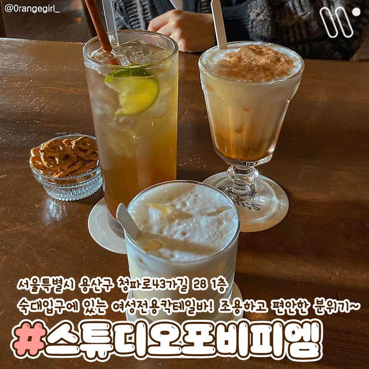숙대 입구에 있는 여성전용 칵테일바! 조용하고 편안한 분위기가 좋다.