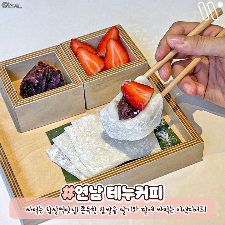 희한한 싸먹는 찹쌀떡 맛집! 쫀득한 찹쌀을 딸기와 함께 팥에 싸먹는다.