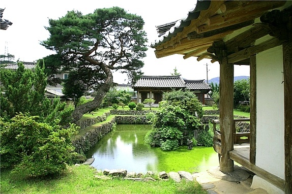 * 주택정원-유미주의 운조루(대문앞에 장방형지의 지원을 조성, 사랑뜰에 소나무심고, 헛간앞에 위성류식재)